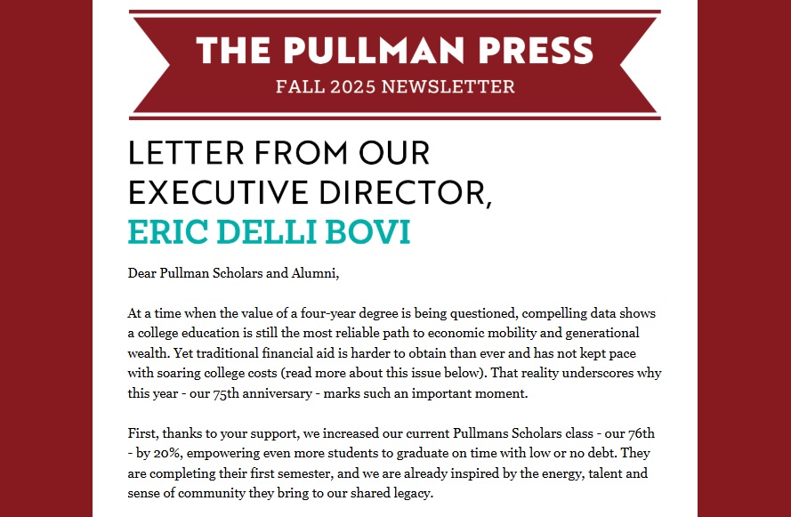 By Eric Delli Bovi Public confidence in the worth of a four-year degree is at a new low, but the financial reality remains clear: A college education is still the most reliable path to economic mobility and generational wealth. Yet, traditional financial aid has not kept pace with soaring college costs. The Pullman Scholars program […]
